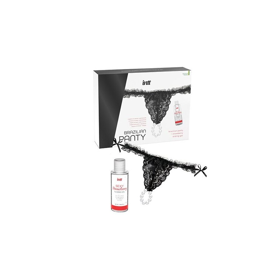 O Brazilian Panty Black da INTT é um pack de lingerie sensual com pérolas acompanhadas por um gel à base de água sabor morango.