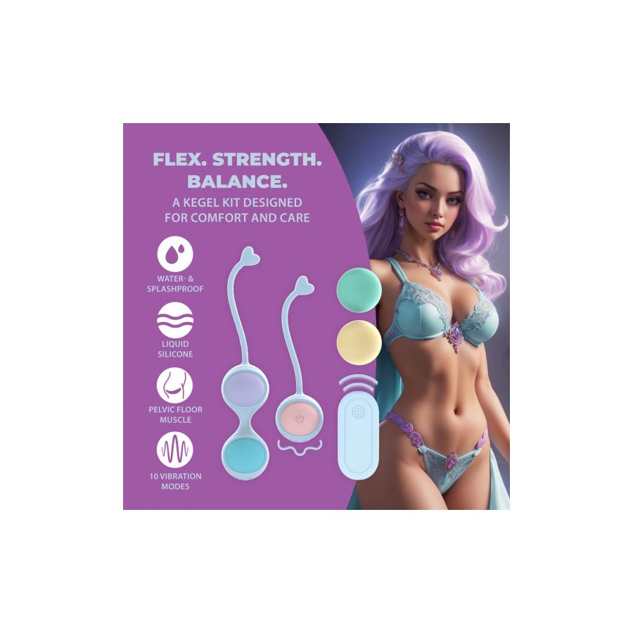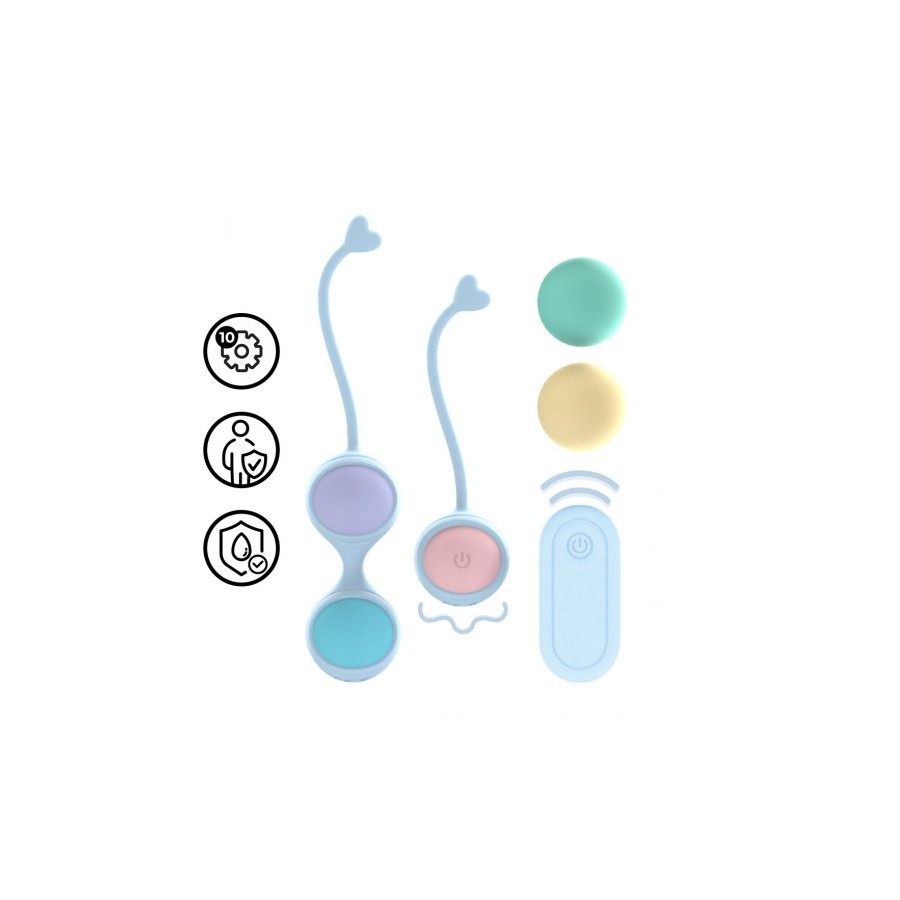 Um conjunto versátil com 5 bolas de Kegel com pesos, incluindo uma bola vibratória, duas capas de silicone para uso com uma ou duas bolas e um controle remoto para uma operação sem esforço.