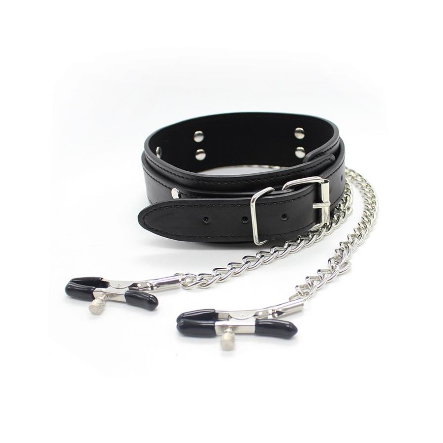 Para dobrar o prazer este colar tem pinças de mamilo, tudo em um. No centro do colar você vai encontrar um aro para o qual você pode fisgar as correntes onde as pinças vão. Essas pinças ajustáveis, você pode colocá-las tão apertadas quanto quiser ou precisar.