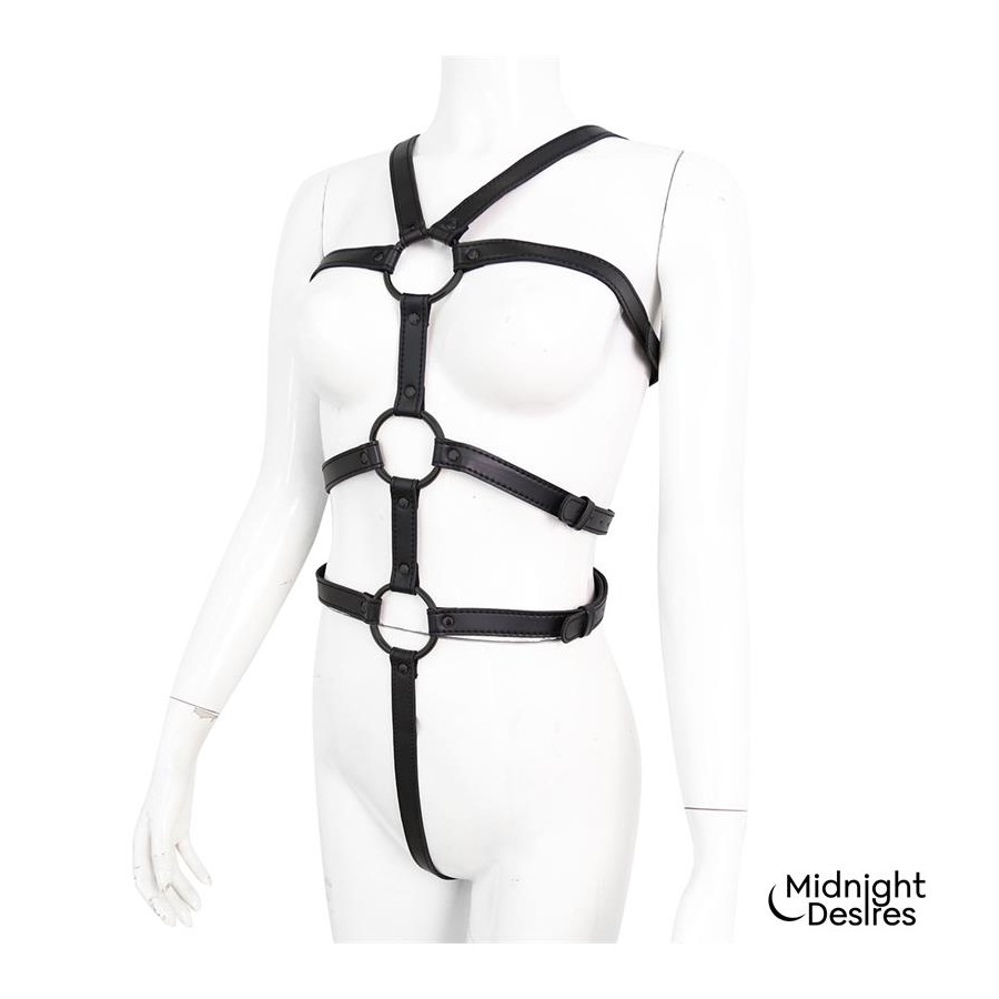 Aproveite a submissão mais ousada com este arnês de escravidão. Este arnês apresenta uma série de tiras que abraçam seu corpo. Você tem duas partes essencialmente, a primeira é a parte do corpo, que tem correias que cercam seus ombros, peito, cintura e quadril. Na frente, eles estão ligados a 3 anéis centrais, e na parte traseira eles são unidos, na parte superior das costas com outro anel, e em três outras correias com fivelas ajustáveis.